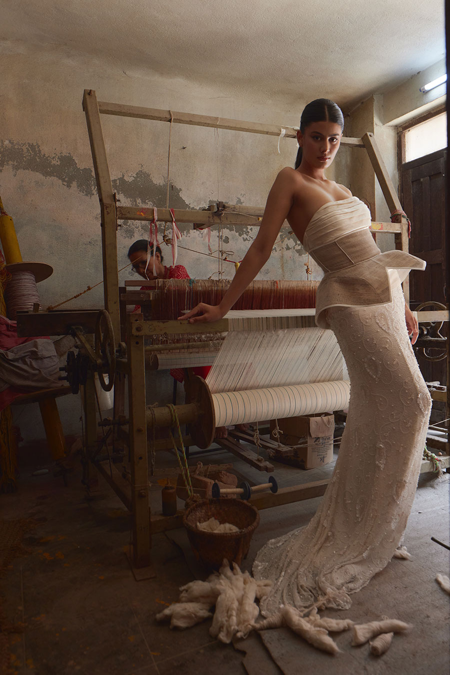 A Nepali fashion model standing alongside a traditional weaver, representing the bridge between heritage craftsmanship and modern fashion design